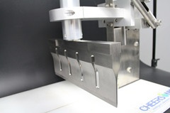 这款设备适用范围较广,可切割蛋糕、披萨、冰淇淋等,接传送带可实现流水线食 品切割生产